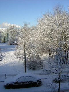 We are having a very cold snap in Berlin at the moment and the forecast is for at least -16°C in the night. It is only -12°C on my balcony at the moment. It snowed yesterday and was so cold that is didn’t turn into slush, which is often the case here. At least the sky is blue as you can see from the picture taken this morning from my bedroom window.