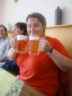 I end with pictures of Larissa, Nina and Petra with glasses of beer and one of Harald sinking a Schnapps with a Gummi-Bärchen.