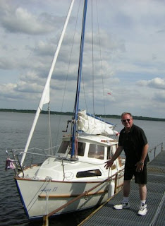 I fell in love with it immediately. It was built in Poland where he bought it in 1996. Classic design to which he recently added a Yamaha outboard motor which has more power than the original. We removed all its covers and put the motor on and gently eased our way onto the lake. I was on the rudder as you can see on the photo and steered it through the posts into the lake. At least I had not forgotten my sailing/rowing lessons from Sweden in 2003.