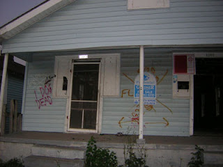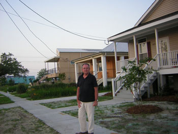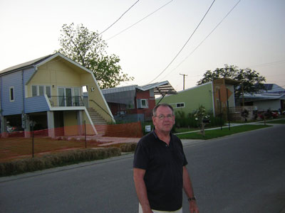 The singer-pianist Fats Domino lived in this devastated area. He had to be rescued from his roof. Later his house was re-built. There is a photo of me outside the new version of his old house.