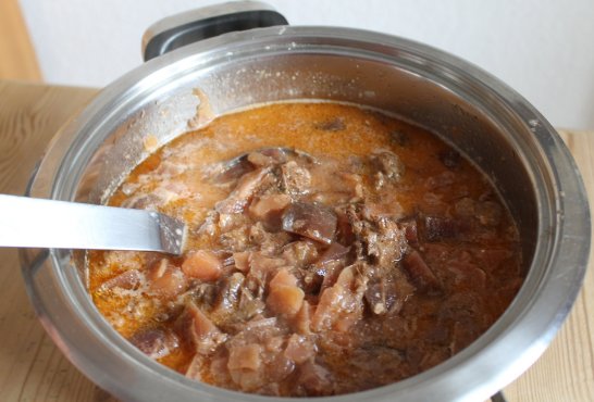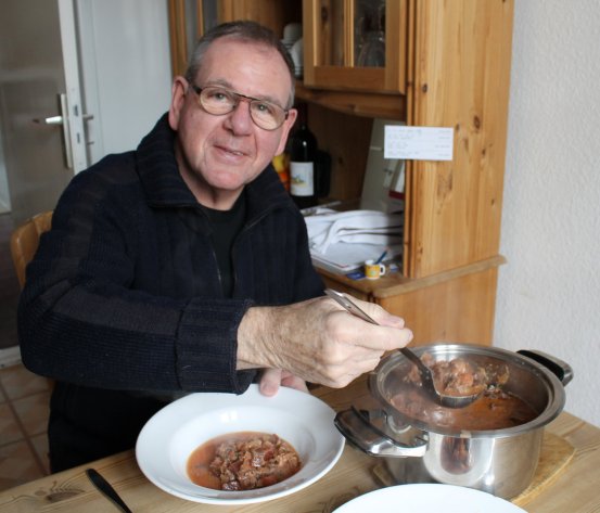 I met Silke for a ‘learn the camera’ session yesterday and she had cooked some Borscht, with meat in the good old German version of the dish. She brought Dr. Mabuse and he helped to warm up the soup and serve it. He also ate some and found it delicious – as I did.