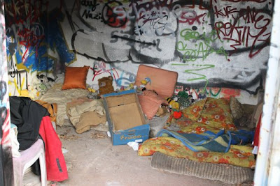 Part of the buildings was a room – perhaps a rest room for workers then – now covered with graffiti, as are all the remaining buildings. This room had a chair, clothes mattresses and a collection of dolls. One of which was a lion with a union jack on its chest. Strange indeed!