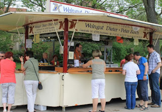 After a 50 minute wait a No. 27 Tram arrived. Full – no surprise there! I squeezed in. I arrived late at Rathaus/Town Hall Köpenick to see Falk and Elvira anxiously waiting for me. A short walk to the side of the river and an empty table. Time to celebrate the Winzer Fest. It means a wine festival.