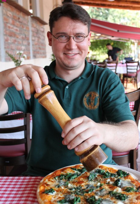 By then, we were feeling a litte hungry. I asked a couple of locals for a German restuarant to be told that there wasn’t one! Only Italian, Greek or Chinese – unbelievable! We settled for a local Italian and filled up on calories. A nice photo of Stefan ‘peppering’ his pizza! I ate pasta.