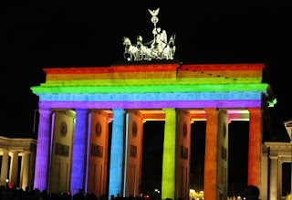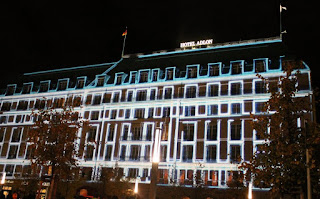 Not far from the Gate is the famous Adlon Hotel. It was famous until 1939, then it disappeared like a lot of central Berlin as a result of bombing raids. I am not sure what was on the site during the GDR. I think it was left empty. The hotel has now been re-built and you can see it lit up in the photograph on the left.