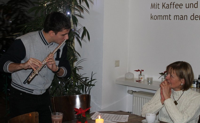 We went into a small cafe run by a lady called Maria. She is from Poland and Marga recently got to know her. Unfortunately she was not there when we visited. Instead we met a nice assistant from Iraq, who spoke very good German. We had a coffee and after the other guests left I asked if Marcel could play flute.