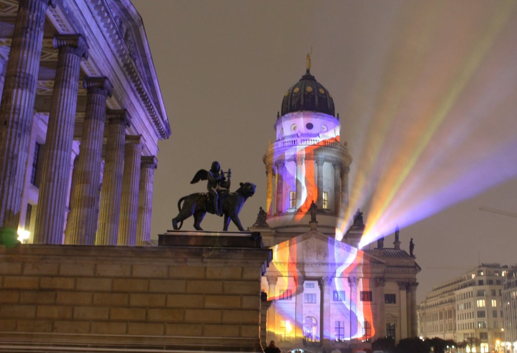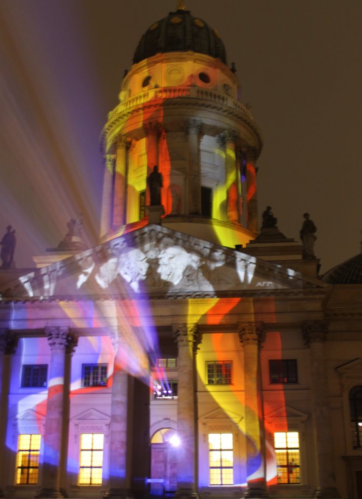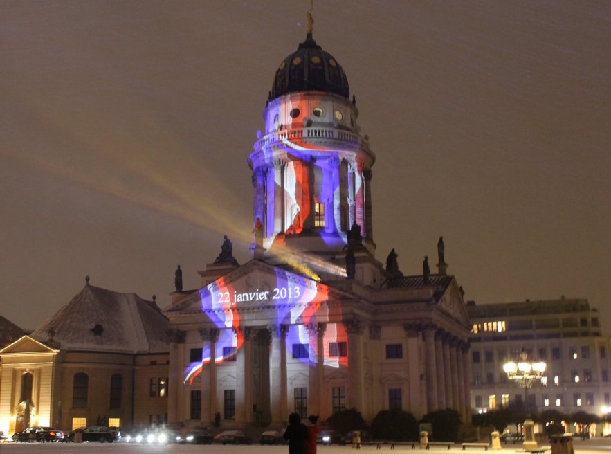 The treaty has shaped French-German relations at all levels ever since, and was celebrated by a light show on the two cathedrals yesterday evening. Silke wanted to record it by taking photographs and I happily went along. I had some problems with settings and darkness, but managed to get a few shots. Here they are to mark the founding of a remarkable and far reaching agreement many years ago.