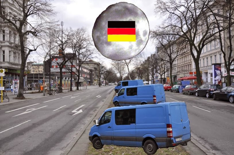 We did some work with Photoshop and I practiced more cutting out and building up a new picture. I decided to fly to the moon. There I hoisted the German flag and flew back. On my return to Berlin, I parked a blue van three times in the middle of the road. Time was up so I couldn’t add anything else.
