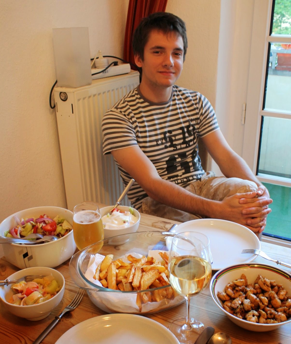 As the temperature rose, I made my way home on Friday to greet Marcel. He had cycled from his flat for an evening of cooking and relaxing. We started out with looking for a recipe. He found one for Giros Plate. It was all Greek to me!