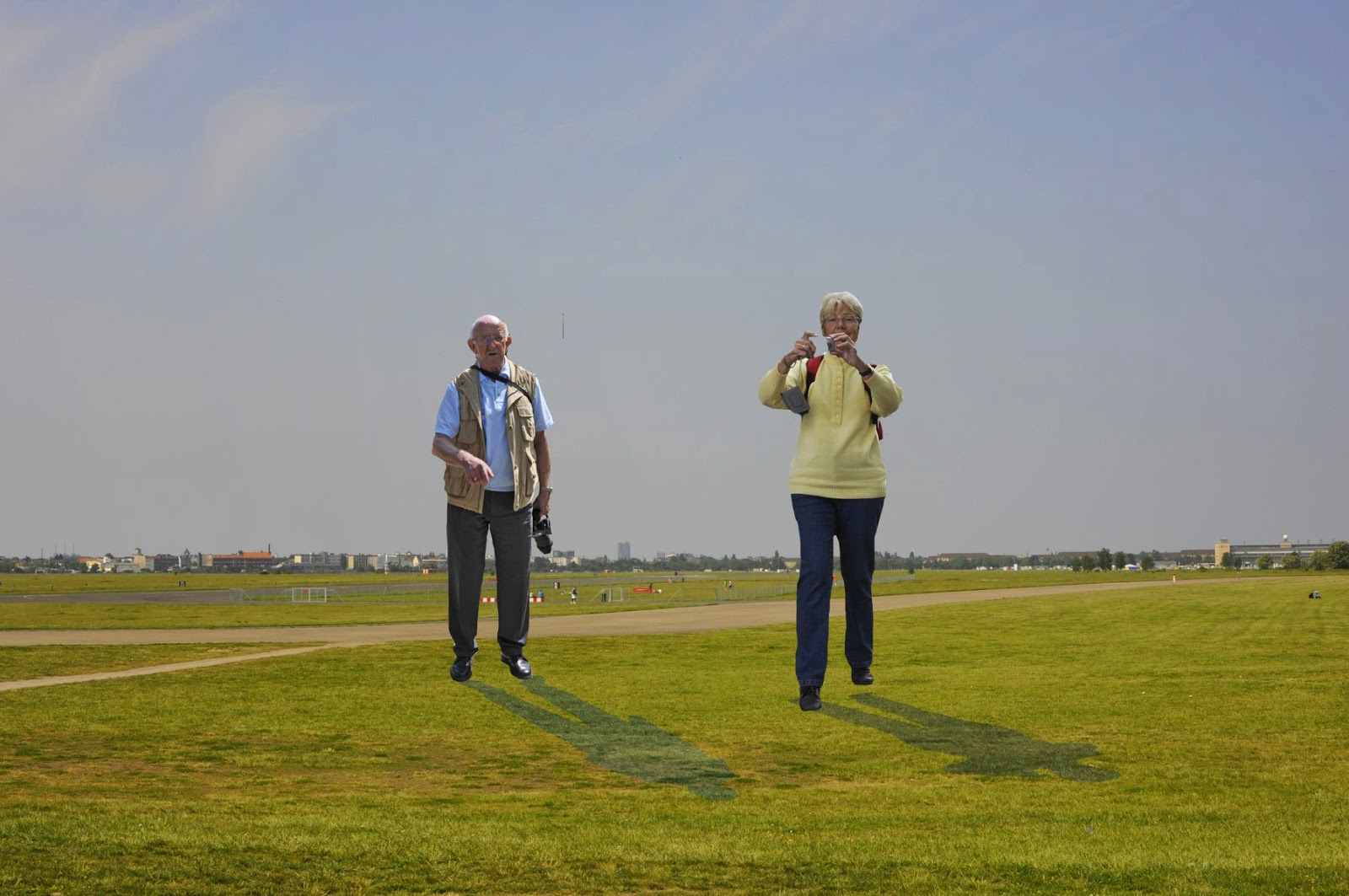Last Friday afternoon I went to my Photoshop Gang meeting and after coffee, cakes and catching up on news, we played around with a few images. We took a background photo of the old inner city airport, added photos of two of our members then noted they needed shadows. We added shadows but it is a secret how we/I did it 🙂 As usual, it is not real but looks so.