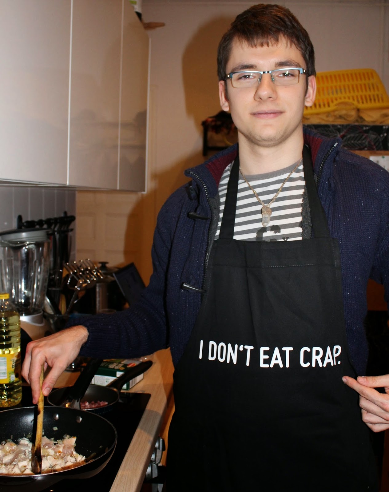 We had arranged to go to a local restaurant but he announced he wanted to cook and had already bought the ingredients. I didn’t argue as I opened a nice bottle of red. I turned around to see him putting on an apron. Then I saw the words. Again, eyes staring to express my surprise. He just asked what I was staring at and said he liked the apron.