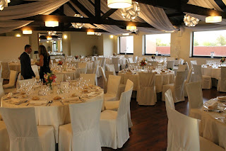 We stopped at a large restaurant on a hillside outside Oviedo. The first part of the reception was outside. Lots of waiters, snacks and trays of drinks moving around.