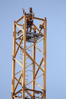 Interesting that as dismantling took place we went from three to one man. My last shot is of the main shaft section being lowered to earth. The climber who had waved had gone down to the next section and safety. I still could not do such work. Could you?