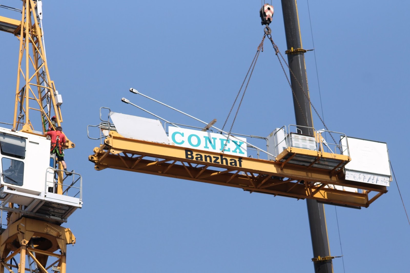 To begin, they did not wear a safely belt, but as they started to dismantle it they anchored themselves to the crane. This allowed them to safely move onto the section that would later be lowered to the ground.