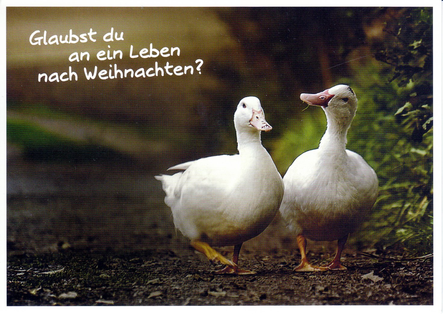 My translation of the German words is: ‘ Do you believe in life after Christmas?‘ The question is being put by Goofy Goose on the left and Charlie Goose on the right is turning his head slightly to show he is pondering the question :-))