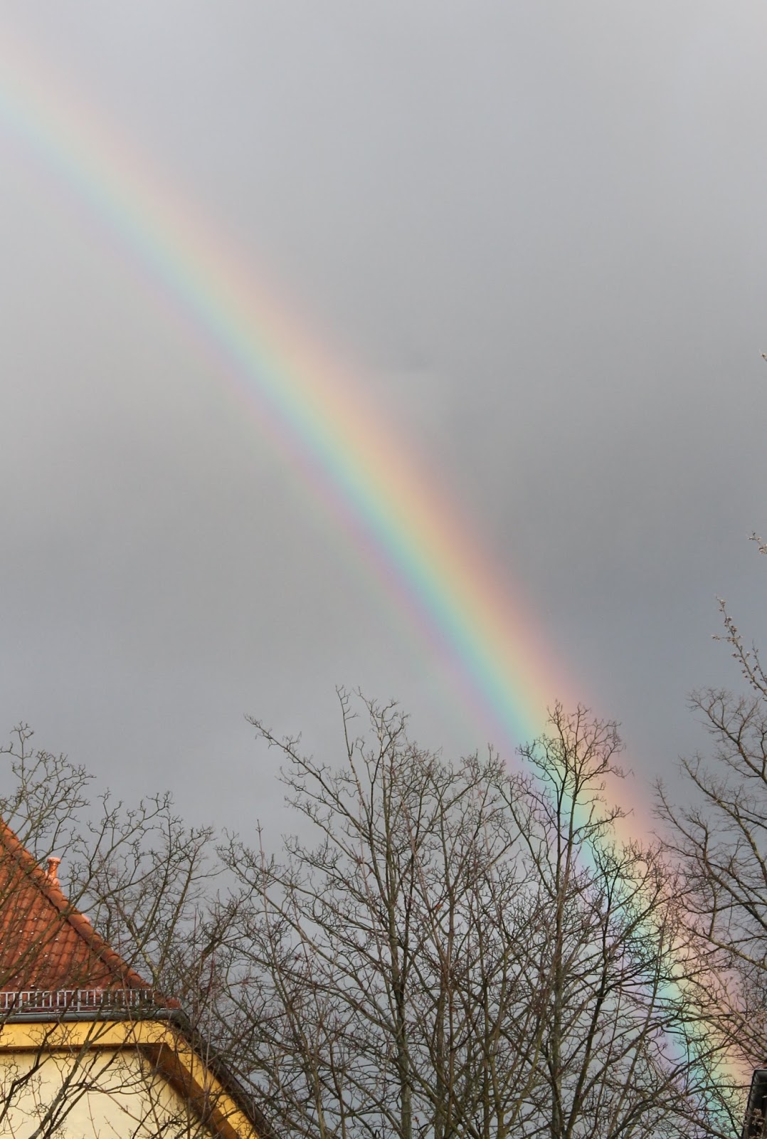 I’ve had a busy week and only just managed to take this shot. I wandered into the kitchen after crawling out of bed on Wednesday morning. I looked out of the window and blinked. A rainbow was forming!