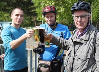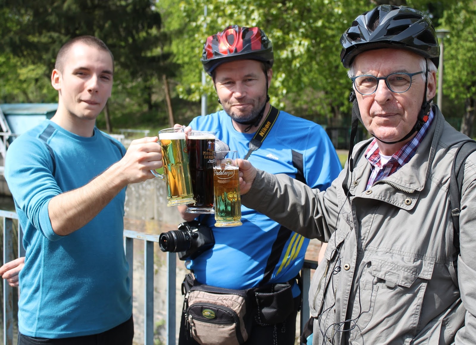 We met the rest of the Gang there and toasted the event in an appropriate liquid form. Yes, a drop of water from Ireland. Onto the bikes and off. Uli had organised the day and the tour took us west along a canal to Finowfurt. On the way we had our first stop. I had coffee to wake me up and a few others had something else. See photo above.