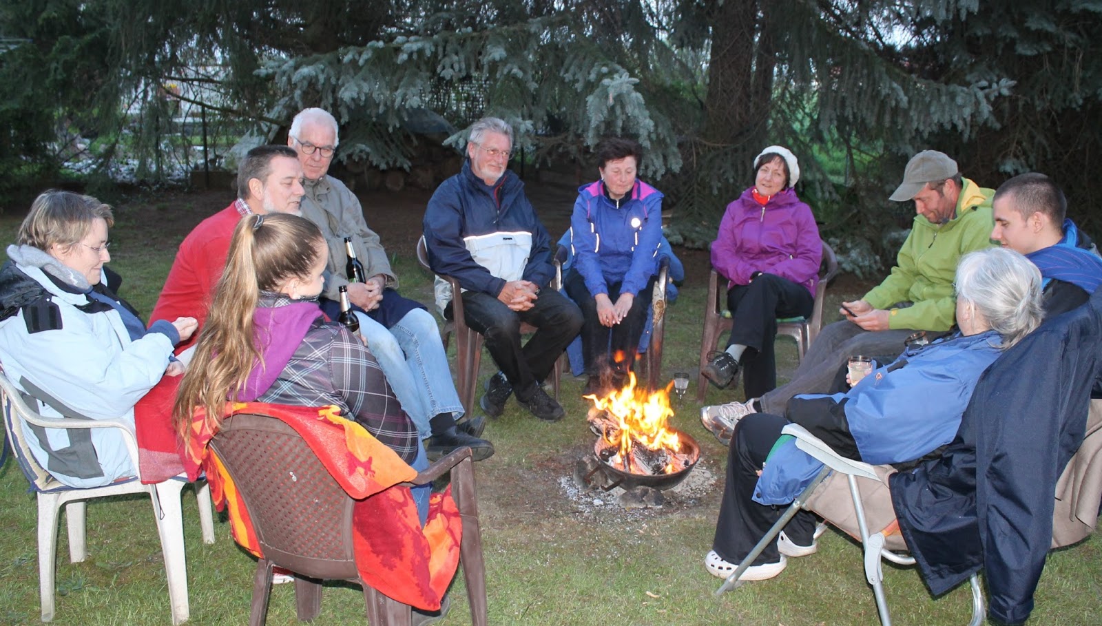 Larissa and husband H-D were waiting for us in the large garden of their house. See photo. There we relaxed with liquid refreshments and grilled as it got dark. We moved to circle an open fire in the garden as we talked, had a few more drinks and sang traditional folk songs. ‘The Birnbaum’ was very popular and I sang one verse!