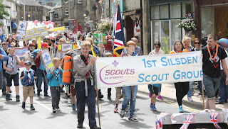 We walked along Silsden beck for all of two minutes until we got to the bridge at the Post Office and pushed to the front of the spectators. Just in time to catch a gang of Oldies bashing out jazz tunes at the front of the procession. There then followed various groups of people such as Scouts/Guides, local football association, church groups, dance groups, keep-fit groups. I think you have an idea of the participants.