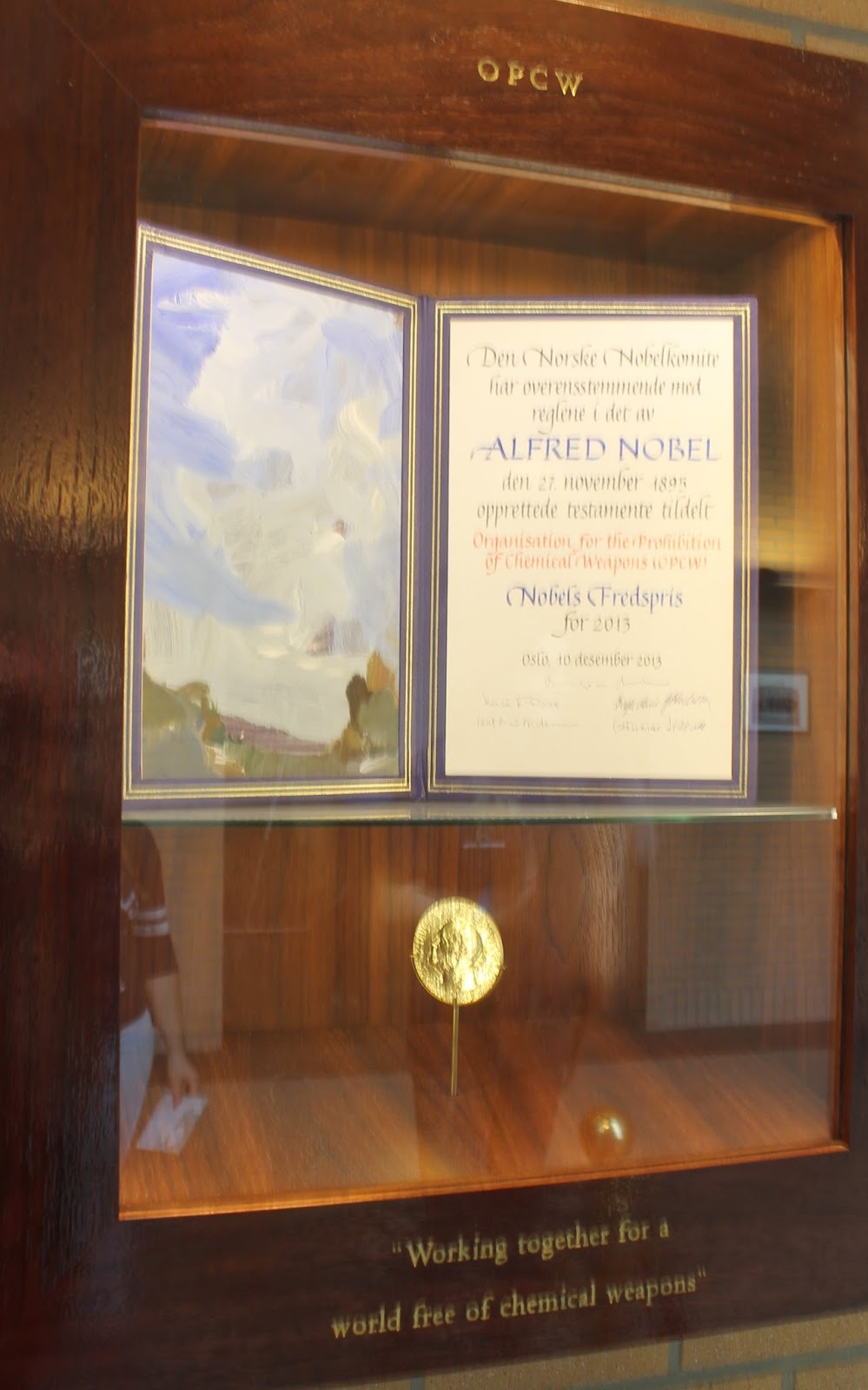 By now, almost 93% of all declared chemical arsenals have been destroyed under OPCW verification. There are still four states which will not allow access to their chemical arsenals. Even so it is a remarkable achievement in disarmament. The OPCW was awarded the 2013 Nobel Prize for Peace. Here is a not very clear photo of it.