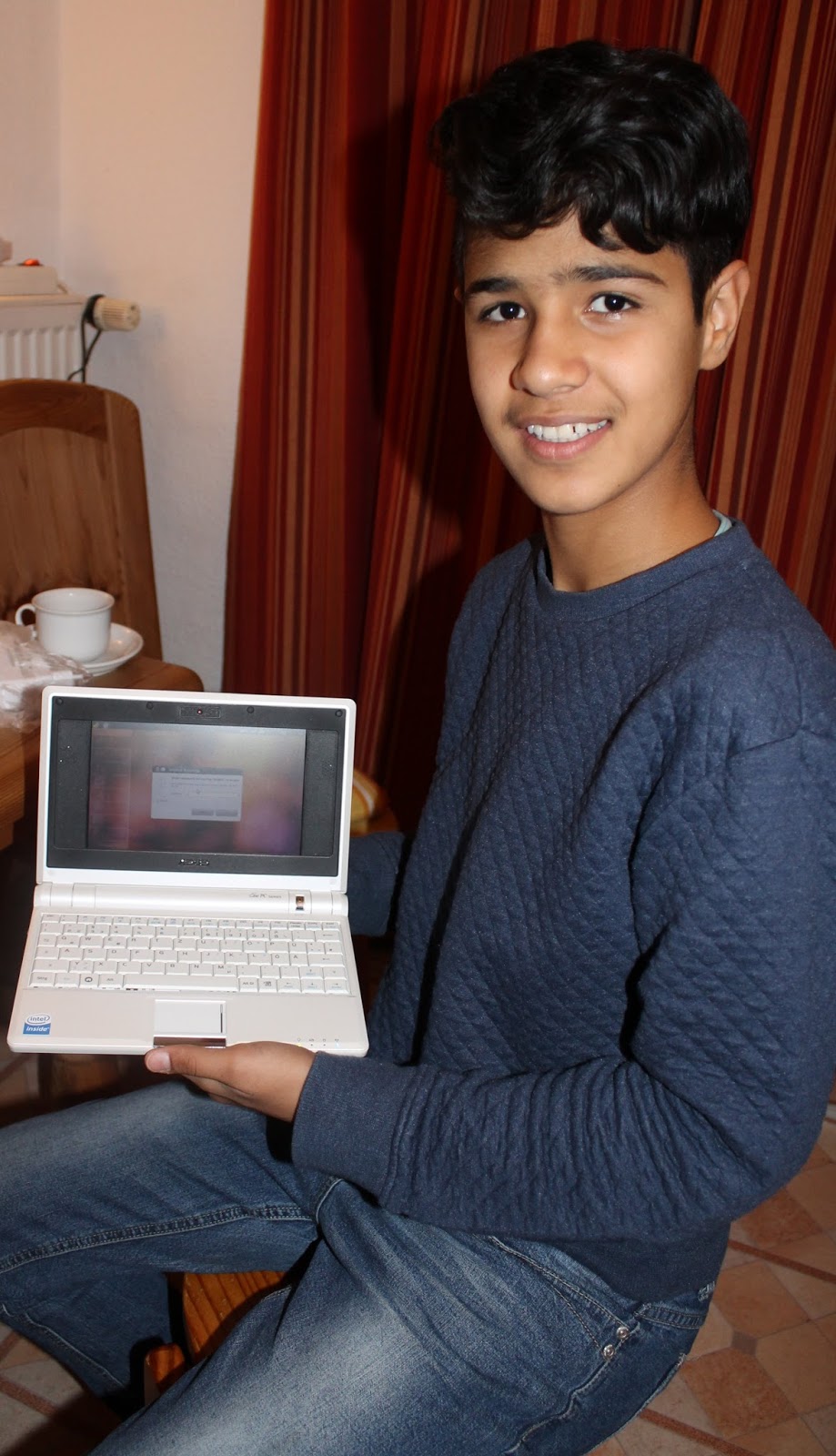 Son2 did all that and opened files, e-mail accounts, looked at photos and generally became the boss of the baby laptop within ten minutes. I just stared and wondered how he could do that! I told him he could take the machine home and share it with his brother and sister. Then came the BIG SMILE. You can see that in this photo.