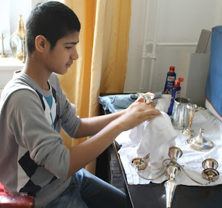 Meanwhile, I put Bro2 to work. His task was to polish my silver. Here you can see him at work and he did a good job for a beginner. They both asked if they could shower and of course I said they could. I will not bore you with details of the poor facilities for bathing in the home where they have to live. We are meeting next Thursday to buy new sport shoes for both.