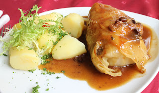 They are simple but solid meals such as the one I ordered. It is called Kohlroulade which means stuffed cabbage. Kohlblätter means cabbage leaves and they are wrapped around a piece of minced meat (with seasoning) which forms a filling. It is served with potatoes and gravy. That is it – simple and very tasty!