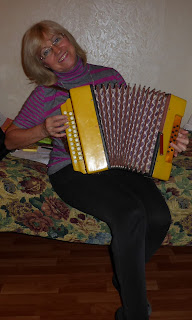 I used to work with her and have very happy memories of classes at her school. Here is a photo of her posing with a ‘local animal’ and playing an accordion. I look forward to more summer parties in her family garden.