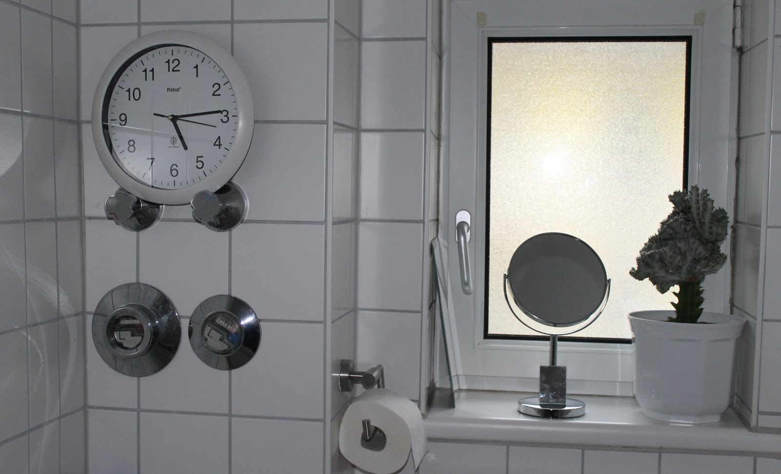 Look at the photo and work out what it could be. The window? — er, nooo……the toilet roll holder? —- er, no, there are two but only one in the photo. I provide a service for those who are left handed and those who are right handed :-)) The plant? — er, no, that’s been there for some time but I did put it into a larger pot on Friday. Okay, so you give up. The answer is the clock! On special offer so I bought one I could see even without my glasses!
