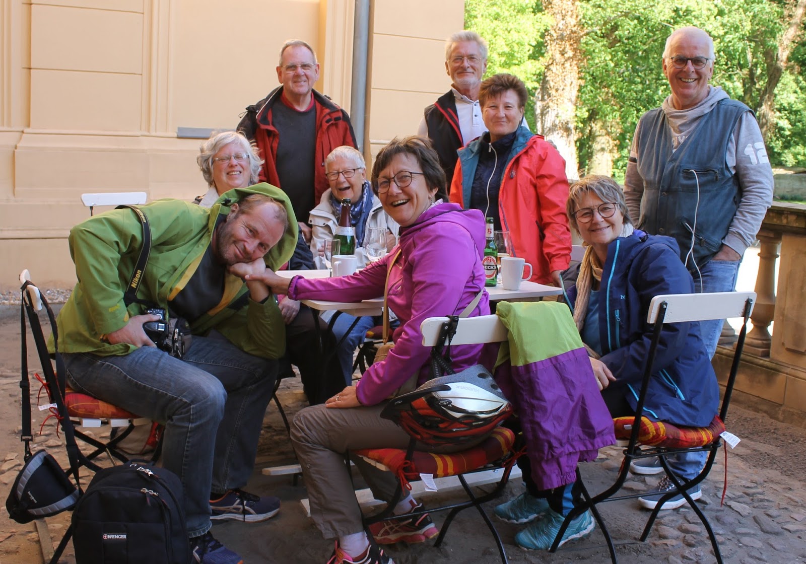 Off again to the east and a river  that feeds into the Oder behind high protective banks. There, some of the Gang had a doze on the grass while others sampled something in small bottles. Yes, it was us ‘Lads’ sampling again! From there we cycled north to stop at the park and Schloss Altranft.  Here is a photo of us relaxing there.