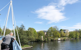 We stopped at a bridge which marked the convergence of two rivers. Here is a photo of Imre looking at the water from the bridge. After enjoying that view, we cycled further and took a route past a hospital and onto a cycle track that took us onto the south shore of Lake Muggelsee.