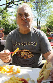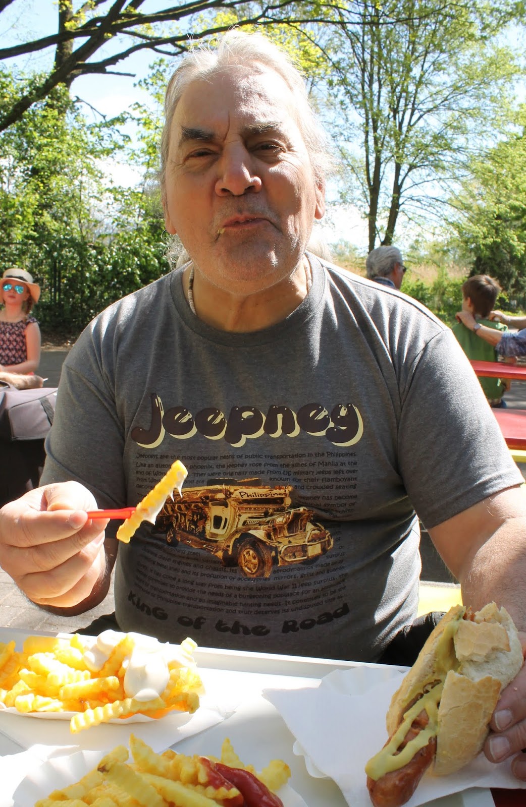 We met at my local S.B station and slowly cycled down to Wühlheide Park. One of my favourite areas to visit and enjoy the green environment. As we got near the childrens play area, Imre said he had not eaten breakfast and wanted to eat chips. In two minutes we were at a ‘snack-caravan’ which served chips with sausages.