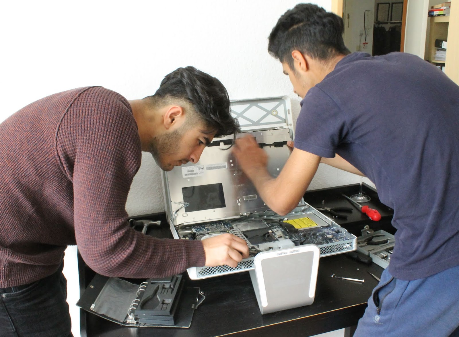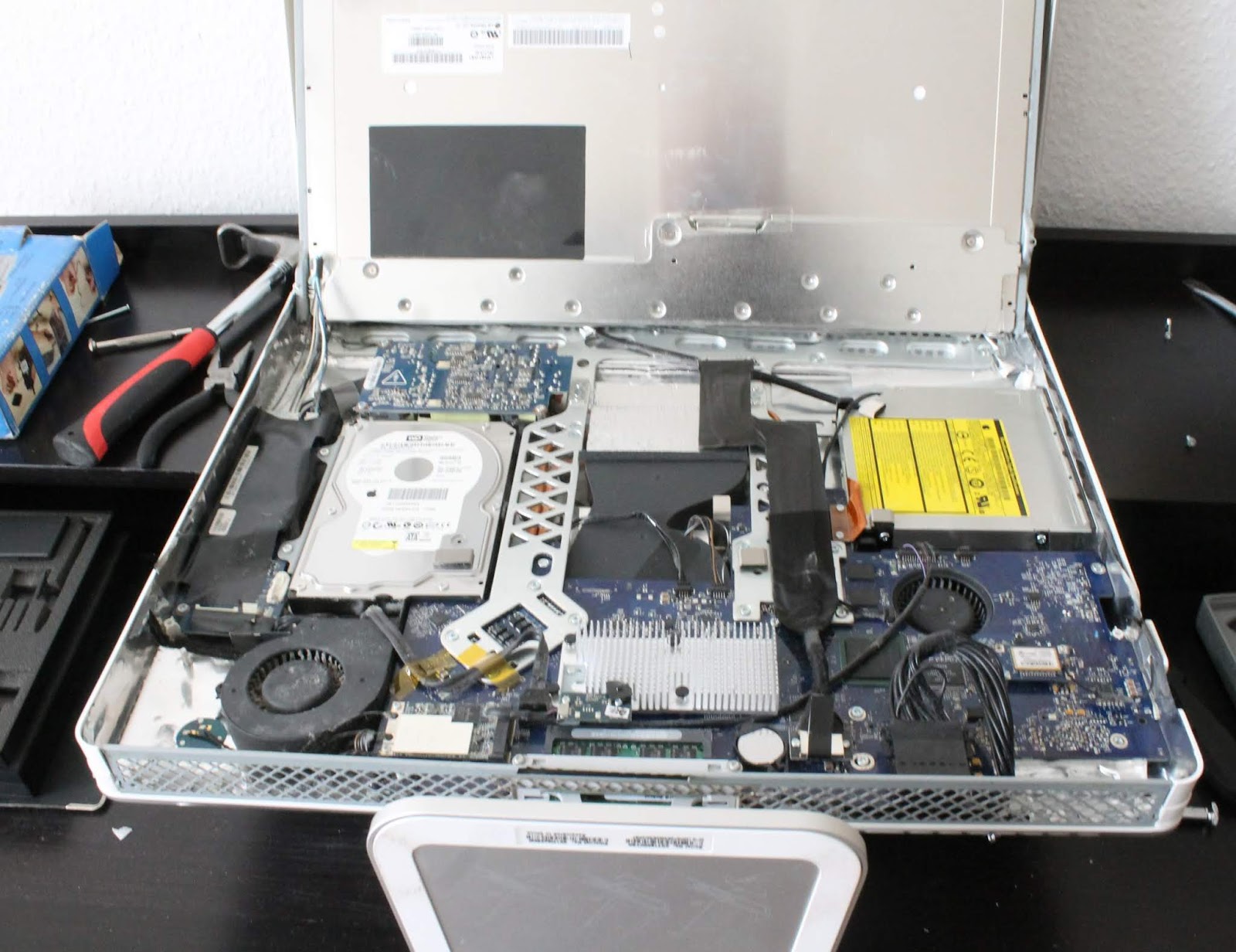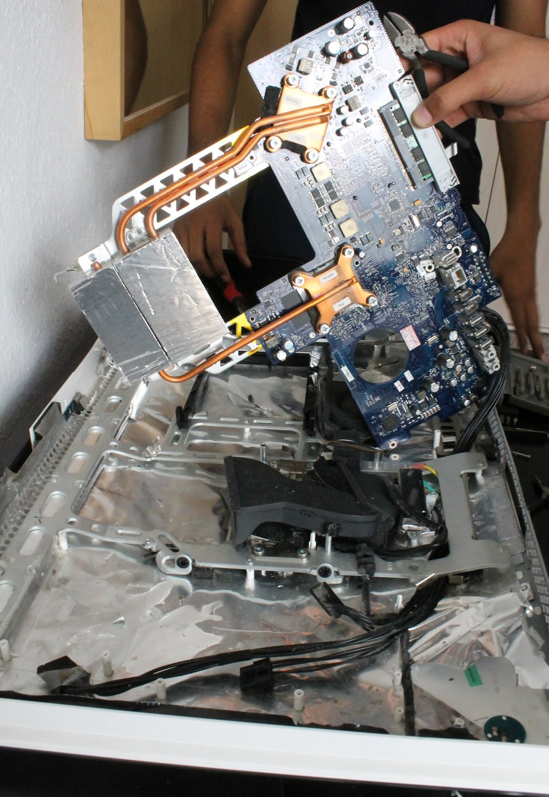 Goodbye to my iMac. I was interested to find out how the computer parts worked behind the screen. As I started to dismantle it The Boyz came into the room and started to take over the work. They clearly enjoyed seeing what was behind the screen and the challenge of dismantling it – as you can see in this photo.