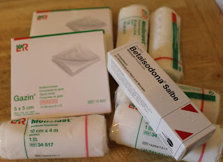 Imre was very supportive and I am grateful for his help. We decided to have the picnic in my kitchen. I got even more of Imre’s news and opinions and was grateful not to be alone. Imre then left. We both agreed that the bicycle ride had not ended as we planned! This morning I went to my Dr. He dressed the wound and gave me 3 prescriptions for bandages and medicine. Here you can see some of these. I will not show you a photo of the wound. Not very nice. Ow!