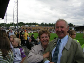 Alan cycled there and back on Daniel’s bike. Back home we had a light lunch then it was wheelie time down to Cas Tiger’s ground to watch them beaten by ‘uddersfiel! You can see Linda between Alan and Lynne in one pic — in the ground.