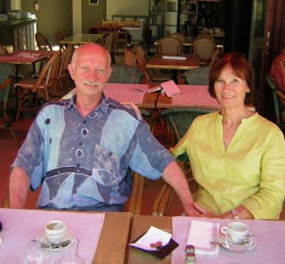 The photos here will include Claviers which is built on the side of a hilltop. Their house is in the middle with a wonderful view onto the valley below. You can see Hannelore and Peter after lunch where we celebrated their first year there. There are some of me, including one where I am selling a bottle of wine. Actually it is a joke for the shop owner posed as the customer and had a great laugh.