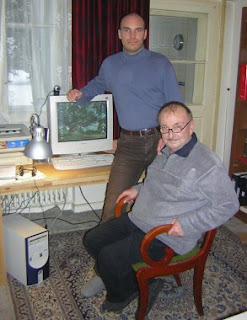 I added links to the browser, got the printer working and set up his Skype connection – and had lunch with them. A very interesting day and I learnt more things about a computer. You can see a photo of said machine, and the happy owner with the creator standing behind him.