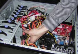 Stefan began by explaining why he was partly constructing the mother board before adding other parts to the housing. Then he inserted the mother board and began to connect everything. Finally he added the housing before connecting to a monitor.