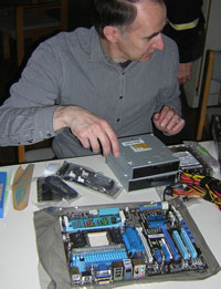 Stefan began by explaining why he was partly constructing the mother board before adding other parts to the housing. Then he inserted the mother board and began to connect everything. Finally he added the housing before connecting to a monitor.