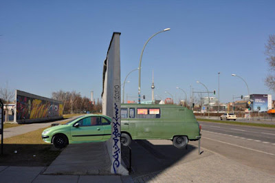 He created some images to show us how to do the work. One clever idea is of a DDR Barkas entering the Berlin Wall and the front of a Peugot emerging from the other side.
