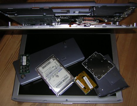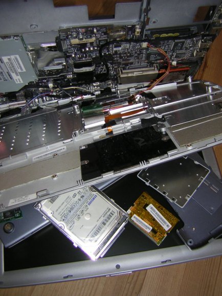 Yes, so John had to remove parts of poor laptop before he hands it to a dealer and makes €30,-. Here are two photos of poor old trusty laptop giving up its valuable bits before being sold off for scrap!